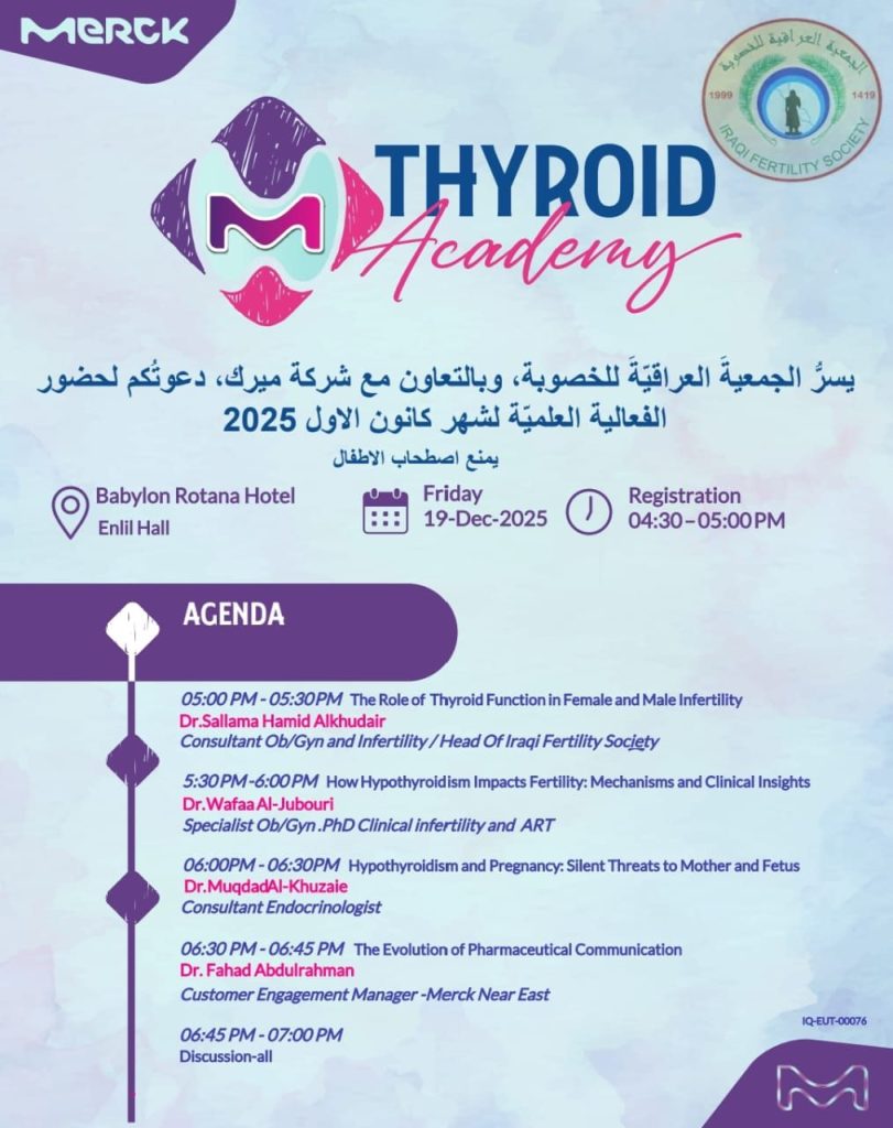 قدمت الجمعية العراقية للخصوبة الفعالية العلمية والاجتماعية الاخيرة لعام 2025 وهي ندوة علمية مهمة عن اضطرابات الغدة الدرقية قبل و أثناء الحمل و خلال برامج التنشيط لتأخر الحمل بتاريخ 19 كانون الاول 2025